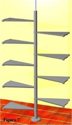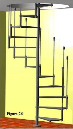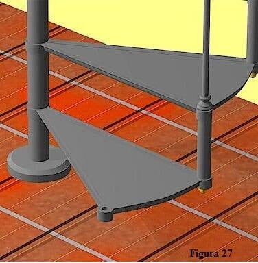 Facendo ruotare i gradini sull'asse uno per uno, si posizionano via via uno sotto l'altro nella giusta sequenza, si interpone un distanziale laterale, si infila una colonnina, si stringe (Figura 23). Così via fino all'ultimo gradino in basso, il primo a salire.