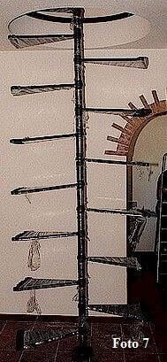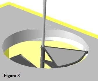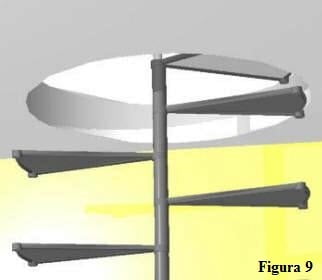 Naturalmente occorrerà comunque un sostegno provvisorio per evitare che il palo si inclini sotto il peso dei gradini, dato che per adesso l'unico fissaggio è quello alla base. Tuttavia questa disposizione rende più facile mantenere l'equilibrio che non disponendo i gradini direttamente a raggiera, cosa che potrà essere fatta ugualmente in un secondo momento, dopo aver fissato il pianerottolo e bloccato l'asse centrale anche in alto.