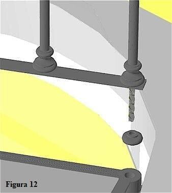 L'ultima colonnina porta inserito un perno filettato, che andrà infilato nel foro del pianerottolo. Per compensare la differenza di quota tra il piatto di portata ed il piano del gradino, in corrispondenza del perno filettato va inserito un piccolo elemento distanziale, che farà da punto di forza per consentire di stringere il dado che bloccherà il tutto. (Figure 11 e 12)