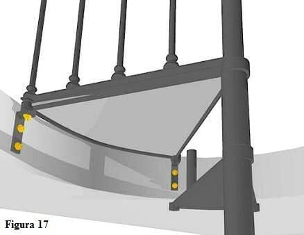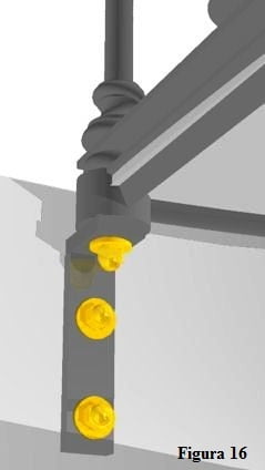 I due fori della parte verticale servono a bloccarla allo spessore del solaio con dei tasselli, mentre il foro della parte orizzontale serve a ricevere il perno filettato che proviene dalla balaustra terminale, che verrà bloccato col dado cieco in dotazione. (Figure 15 e 16 )