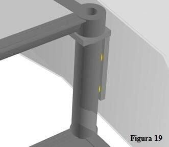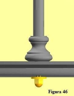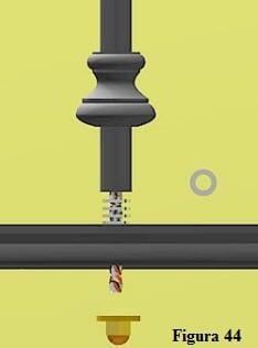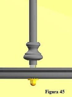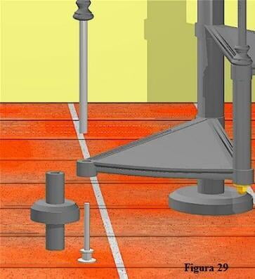Fra le colonnine in dotazione ce n'è una diversa dalle altre. Il piede, che è la parte più corta sotto il nottolino ornamentale, invece di avere una parte filettata esternamente, è più corto ed ha un foro filettato internamente. Assieme a questa colonnina particolare, viene fornito un piedino, costituito da una barra filettata saldata ad una rondella, e corredato di un bullone e di una rondella più piccola (Figura 28 )