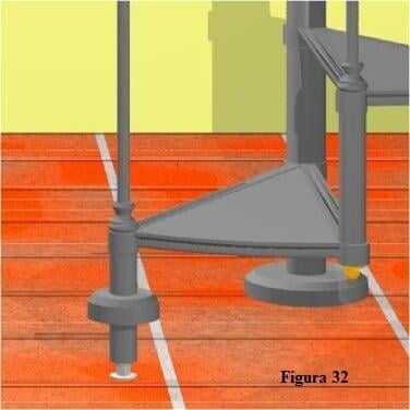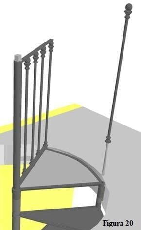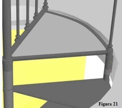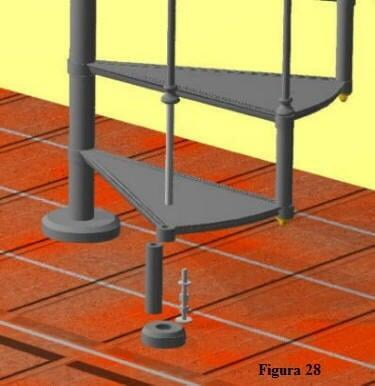 A questo punto si prende una colonnina, e la si inserisce, come illustrato nelle figure 20 e 21 qui sotto, avendo cura di centrare tutti i fori, quello del pianerottolo, quello della staffa, quello del distanziale e quello del gradino all'alzata inferiore