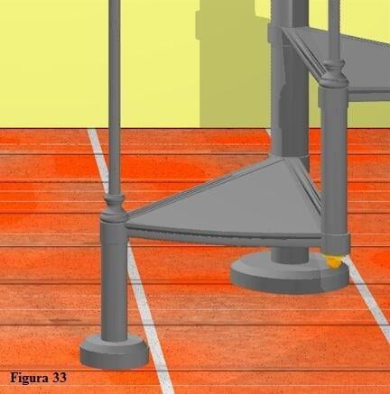 Posizionare l'insieme distanziale-copripiastra-piedino filettato in sede sotto al primo gradino (Figura 32), poi inserire da sopra nel foro la colonnina di partenza e cercare di avvitarla al piedino (Figura 33). Questa operazione si svolge un po' alla cieca in effetti, ma con un po' di pazienza non è così difficile. Tenere bloccato il piedino con una pinza mentre si cerca di avvitare la colonnina aiuta a compiere rapidamente l'operazione. Una volta che la colonnina ha 'preso' la filettatura, avvitarla sino a che la borchia ornamentale non tocchi il gradino. Poi, usando una chiave inglese, svitare il bullone del piedino filettato, facendolo salire verso l'alto, sino a stringere con una certa forza. Infine, lasciar ricadere la copripiastra, che nasconderà il tutto.