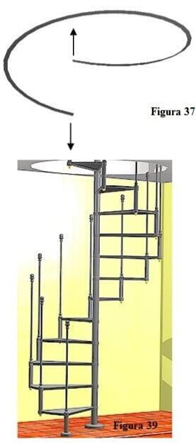 Supponendo di porci di fronte al corrimano disteso in piano a terra, con le due estremità sovrapposte rivolte verso di noi, se solleviamo verso l'alto l'estremità destra e verso il basso l'estremità sinistra (Figura 38) avremo un corrimano per scala destrorsa (cioè, che gira verso destra salendo), se invece solleviamo verso l'alto l'estremità sinistra e verso il basso quella destra (Figura 39) avremo un corrimano per scala sinistrorsa (cioè che gira verso sinistra salendo).