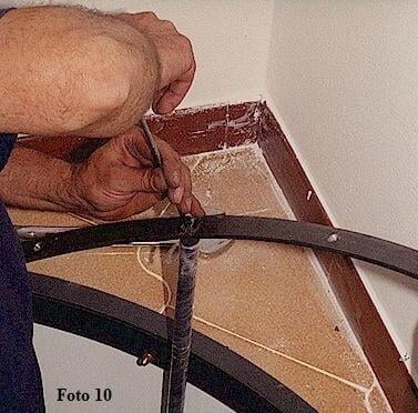 Una volta che il corrimano abbia assunto più o meno la forma giusta, lo si presenta sulla scala. In genere è più comodo cominciare ad avvitarlo sulle colonnine partendo dall'alto. Man mano che si stringono le viti sarà necessario ancora qualche aggiustamento con i piegaferri.
