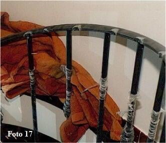 L'installazione del corrimano è la parte più impegnativa di tutto il montaggio della scala, quella per cui avere un po' di esperienza gioverebbe. Purtroppo, come tutta la sapienza artigianale, è difficilmente trasferibile con parole ed immagini. Se non si è mai 'sentito' il ferro piegarsi sotto lo sforzo delle proprie mani e dei propri attrezzi, è difficile che la prima volta il risultato sia perfetto.