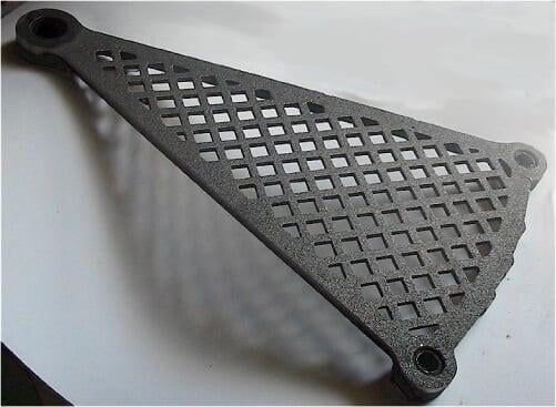 Scala a chiocciola in ghisa con pedata traforata con semplice disegno geometrico a quadrati, ambientabile in arredamenti sia classici che moderni.